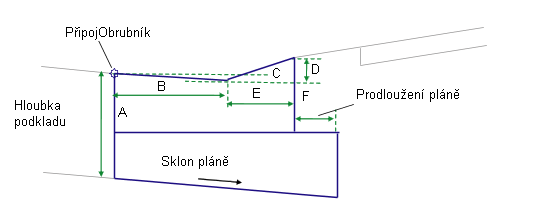 Spojnice obrubníku a rigolu se vloží na základě kót vstupních parametrů (Kóta A – Kóta F). Všechny kóty musí být kladné nenulové hodnoty. Jestliže se zadá nenulová hloubka podkladu, ochranná vrstva se vloží do podloží obrubníku a pokračuje na hodnotu šířky Prodloužení Pláně. Ochranná vrstva uzavírá spodní část podloží obrubníku tak, jak je uvedeno v diagramu.