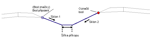 Umístění bodu připojení a označeného bodu jsou zadána. Označený bod může být buď vlevo nebo vpravo od bodu připojení. Spojnice směřují dovnitř se Sklonem 1 od bodu připojení a se Sklonem 2 od označeného bodu, až se protnou. Je-li zadána nenulová šířka příkopu, horizontální spojnice spodní části příkopu se vloží do protínajících bočních sklonů.