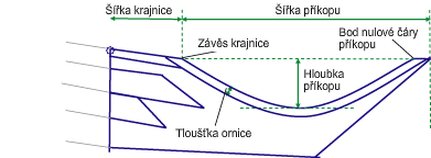 Je-li materiál ornice nastaven na kladnou hodnotu, vznikne přímo pod spojnicí linie paty svahu vrstva nového materiálu se zadanou tloušťkou. Tloušťka je měřena kolmo k tvaru parabolického příkopu. Horní část příkopu je nakreslena od bodu počátku svahování krajnice po zadanou šířku a hloubku příkopu. Na vnitřní hranu příkopu je přidána spojnice odsazení (podél spojnice krajnice), aby bylo dosaženo zadané hloubky ornice příkopu. Podobně je přidána vodorovná spojnice na vnějším konci příkopu. Pomocí těchto dvou spojnic a tloušťky ornice je vytvořen zbytek parabolického dna ornice. Vzhledem k této nové vrstvě bude šířka horní vrstvy krajnice upravena podle následujícího obrázku.