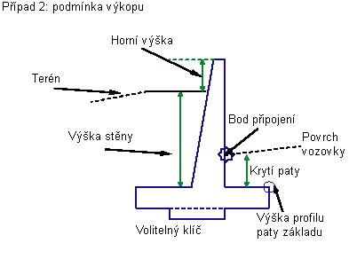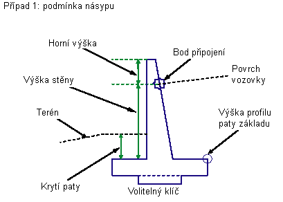 Bod připojení se liší v závislosti na tom, zda je opěrná zeď v podmínce výkopu nebo násypu. Jestliže je v násypu, bod připojení je v horní části opěrné zdi. Pokud je vložena v podmínce výkopu, bod připojení je poblíž spodní části.