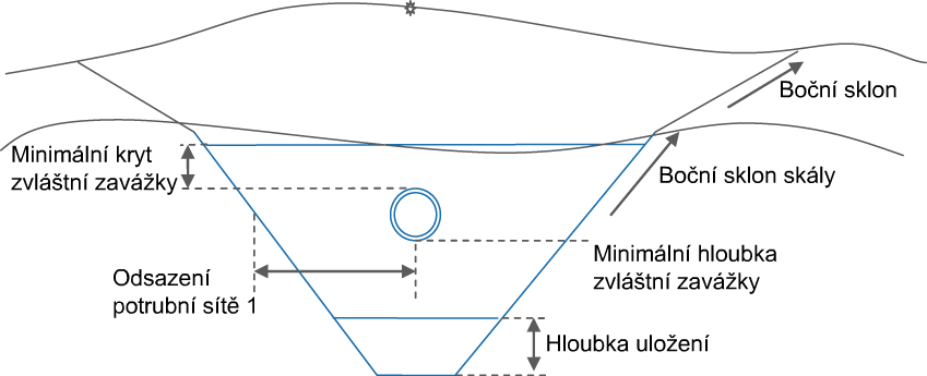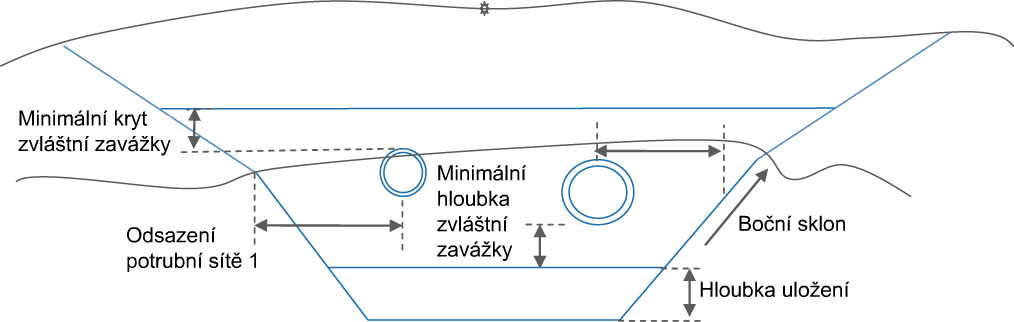 | Minimální krytí zvláštní zavážkou | Minimální velikost krytí zvláštní zavážkou uloženého nad nejvyšším potrubím. Potrubí se měří od vnějšího průměru vrcholu potrubí. | Numerická, kladná | 0.0 |