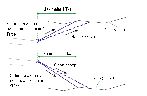 Je-li potřeba, spojnice se upraví tak, aby bod linie paty svahu byl v rámci maximální šířky od bodu počátku svahování.