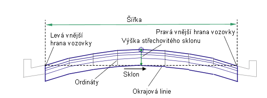 Parabolický tvar je simulován řadou krátkých přímých spojnic. Na jízdní pruhy se neaplikují žádná klopení. Vrstva konstrukce vozovky se řídí standardy, které jsou popsány v části „Vrstva konstrukce vozovky na zpevněných úsecích“ v nápovědě aplikace Autodesk Civil 3D.