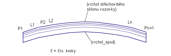 Střed řetězové linie se vypočte odečtením Výšky střechovitého sklonu od bodu připojení a levá a pravá hrana jízdního pruhu se vypočte aplikováním Šířky a Sklonu symetricky kolem bodu připojení. Staniční kóty parabolického oblouku se vypočtou v sudých intervalech podél řetězové linie a za účelem připojení bodů staničních kót se přidají spojnice přímek. Paralelní povrchy se vloží pro povrchy Vrstva1, Vrstva2, Podklad a Pláň pro dané hloubky.