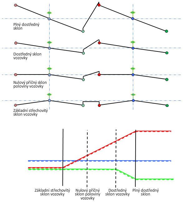 Následující obrázek uvádí metodu otočení Středy pro směrově rozdělenou vozovku se střechovitým příčným sklonem.