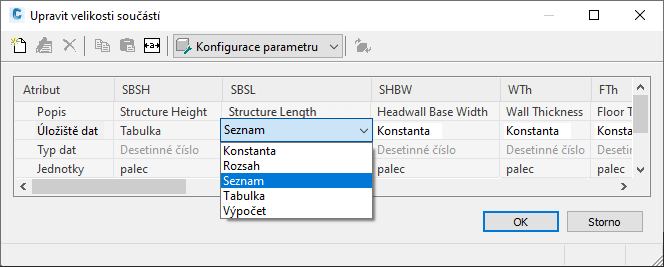 - Chcete-li přidat nové velikosti součásti, klikněte na hodnotu parametru a poté na panelu nástrojů klikněte na tlačítko Upravit.