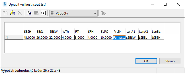 - Definujte název velikosti součásti s vypočtenou hodnotou: