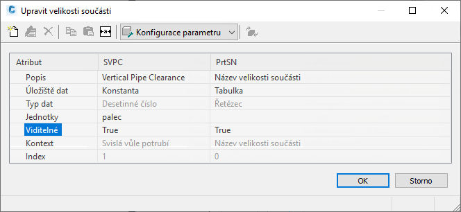 Zobrazí se dialog Upravit velikosti součástí znázorňující všechny aktuálně dostupné parametry velikosti pro vybranou součást. Jako příklad jednoduché válcovité šachty jsou k dispozici některé výchozí parametry velikosti Název velikosti součásti (NVSouč) a Vůle svislého potrubí šachty (VSPŠ).