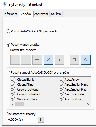 Styly značek lze nastavit tak, aby používaly body aplikace AutoCAD, vlastní symboly značek nebo bloky.