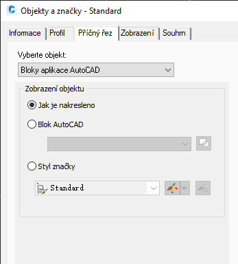 U promítání a křížení můžete nastavit různé styly, které se použijí pro jejich zobrazení a popisky v zobrazeních příčných řezů.