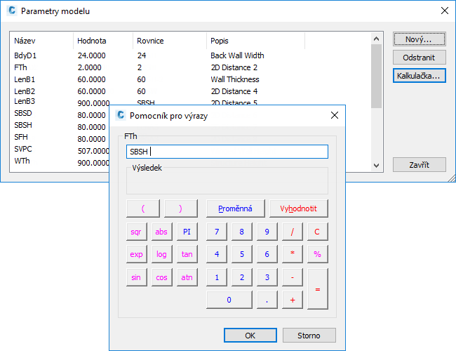 - Klikněte dvakrát na hodnotu sloupce Rovnice pro parametr modelu (například LenB1) a zadáním hodnoty nebo rovnice určete délku součásti.