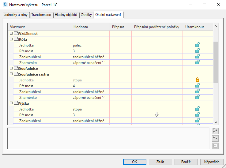 Na kartě Okolní nastavení je ve sloupci Přepsání podřízeného zobrazena šipka vedle každého nastavení, které je změněno pro jeden či více objektů ve výkresu. Tento přepis můžete zrušit klepnutím na šipku, a klepnutím na ikonu zámku lze zablokovat kterékoliv nastavení, zamezí se přepsání na úrovni objektu.