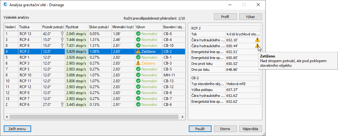 Když v tabulce výsledků vyberete řádek, zobrazí se na pravém panelu podrobné informace o potrubí a stavebním objektu vybrané linie.