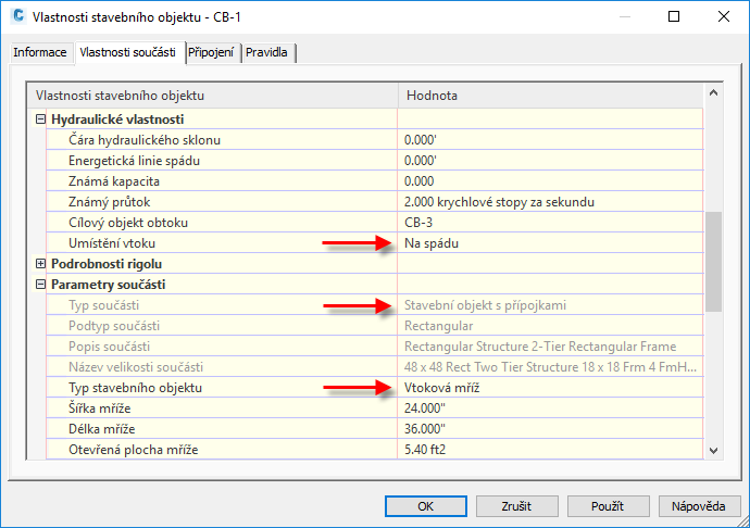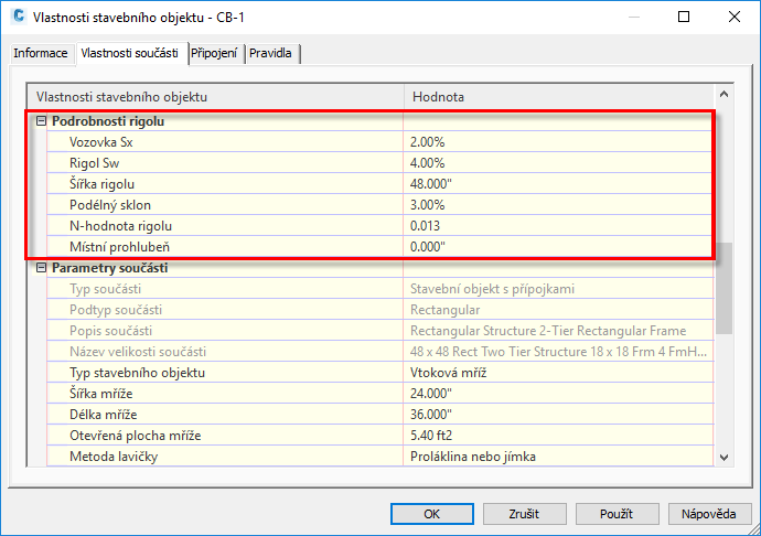 V části Podrobnosti rigolu v dialogu Vlastnosti stavebního objektu můžete definovat vlastnosti plochy vozovky okolo vtoku. Tyto vlastnosti slouží k výpočtům analýzy vtoku u příkazu Analýza gravitační sítě.
