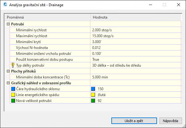 Pomocí příkazu Analýza gravitační sítě můžete změnit velikost potrubí, znovu nastavit dna potrubí a vypočítat linie energetického spádu a čáry hydraulického sklonu podle standardů definovaných v dokumentu HEC-22.