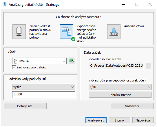 Vybírat můžete ze tří typů analýz: Změnit velikost potrubí a znovu nastavit dna potrubí, Vypočítat linie energetického spádu a čáry hydraulického sklonu a Analýza vtoku.
