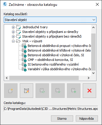 Z dialogu můžete pracovat s katalogem potrubí nebo stavebních objektů a procházet kategorie v rámci tohoto katalogu.
