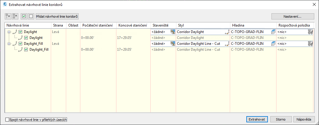 Výběr návrhových linií: Zaškrtnutím nebo zrušením zaškrtnutí políček změňte výběr návrhových linií, které budou extrahovány. Kliknutím na možnost Přidat návrhové linie koridorů se vrátíte k výzvě na příkazovém řádku, ve které můžete vybrat další návrhové linie.