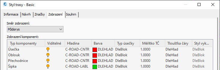 Můžete určit hladiny komponent na kartě Zobrazení <objekt> dialogu Styl. V následujícím příkladu jsou zobrazeny hladiny používané pro komponenty tras: