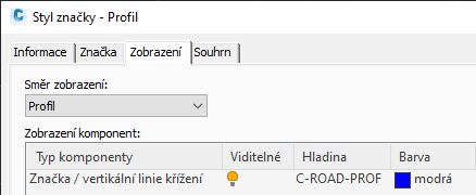 Styly značek slouží k ovládání vzhledu objektů křížení v zobrazeních profilů. Vzhled stylu značek se ovládá pomocí karty Zobrazení dialogu Styl značky. V seznamu Směr zobrazení vyberte profil a prohlédněte si nebo upravte styl značek, který je u zobrazení profilu konfigurován. Zobrazení značky (používané k zobrazení profilů křížení, návrhových linií, polygonů zaměření a 3D křivek) i zobrazení svislé čáry křížení (používané k zobrazení tras křížení) ovládá jediná komponenta.