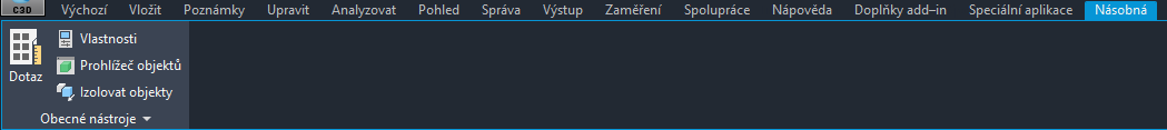 Při současném výběru více typů objektů se na pásu karet zobrazí kontextová karta Vícenásobný. Pokud například vyberete objekt potrubní sítě a objekt trasy, zobrazí se kontextová karta Vícenásobný.