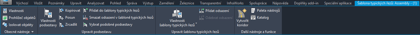 Pokud například vyberete objekt trasy, zobrazí se kontextová karta Trasa. Panel Další nástroje a funkce na kontextové kartě Trasa obsahuje množství příkazů, které můžete dále využívat. Z trasy můžete například vytvořit koridor, křižovatku nebo datovou zkratku.