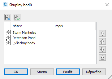 Pořadí zobrazení skupiny bodů pro výkres určuje pořadí, ve kterém jsou skupiny bodů zakresleny při otevření výkresu nebo novém generování obrázků. První (nejvyšší) skupina bodů v seznamu je zakreslena jako poslední.
