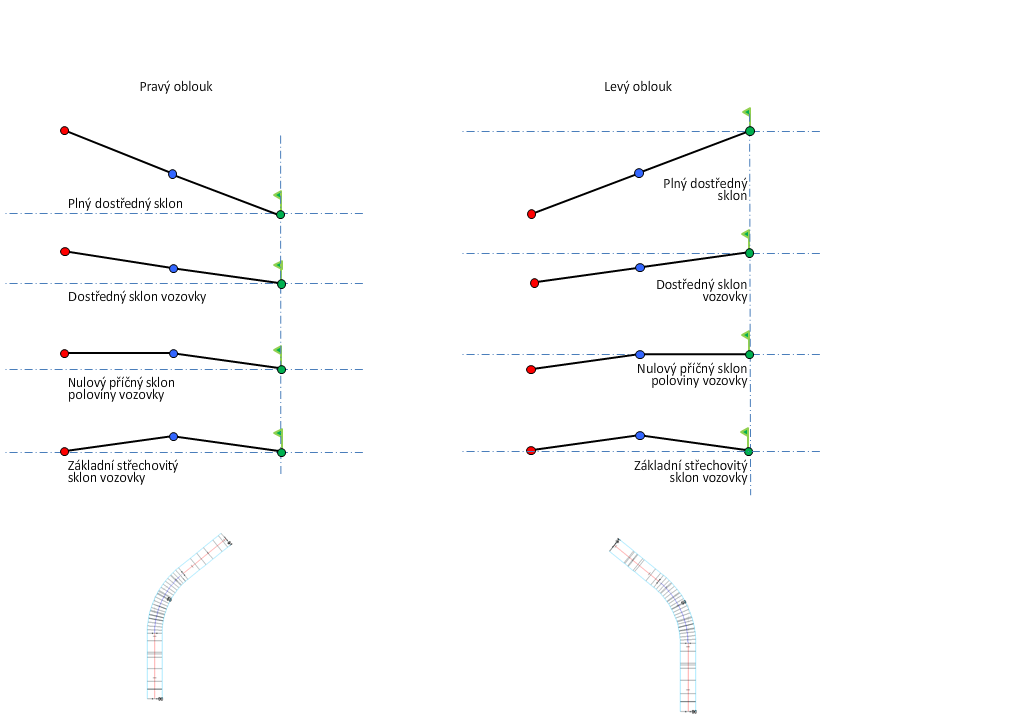 Vysvětlení diagramů klopení vozovky najdete v části Metody klopení osy otáčení okolo bodů otáčení.