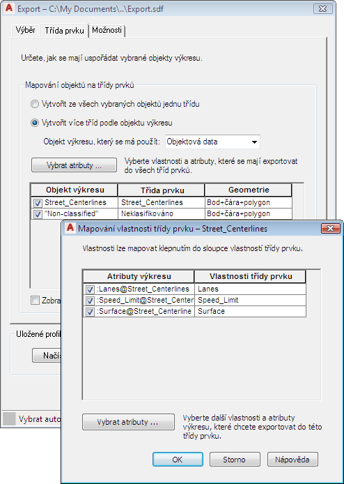 Při exportu objektů výkresu můžete pomocí objektových dat vytvořit v souboru SDF třídy prvků. Výsledné třídy prvků mají vlastnosti, které odpovídají atributům objektových dat.