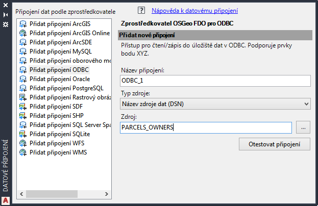 Určete nové spojení v okně Datové připojení. Ze zdroje ODBC nepřidávejte do mapy žádné specifické hladiny tříd prvků. Při připojení ke zdroji ODBC se vám v aplikaci AutoCAD Map 3D toolset automaticky zpřístupní všechna data.