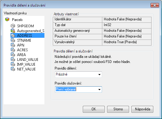 Každá vlastnost prvku Parcely je uvedena pod položkou Vlastnosti prvku vlevo. Dvě vlastnosti (Geom a FeatID) jsou generovány úložištěm dat, proto pro ně nelze pravidla nastavit. Jestliže je vyberete, můžete vidět pravidla, která použilo úložiště dat pro jejich vytvoření.