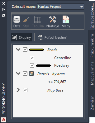 Podokno Úlohy umožňuje rychlý přístup k často používaným funkcím a tyto funkce jsou zde uspořádány do pohledů podle jednotlivých úloh. Pomocí podokna Úlohy lze vytvářet, spravovat, zobrazovat a publikovat mapy.