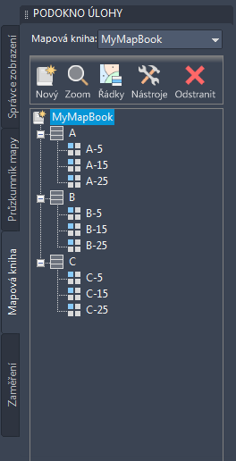 Když generujete mapovou knihu, jsou dlaždice vypsány v podokně Úlohy a pro každou dlaždici je zobrazena jedna karta rozvržení.