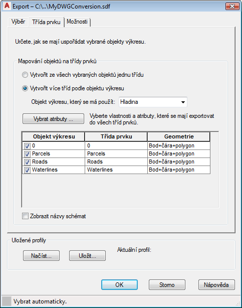 Atributy, které zde určíte, se přiřadí do všech tříd prvků v souboru SDF. Proto vyberte pouze atributy, které jsou vhodné pro všechny třídy. Lze například vybrat obecné vlastnosti, které obsahují například tloušťku čáry apod., ale ne vlastnosti objektových dat, které jsou určené pro každou třídu prvku.