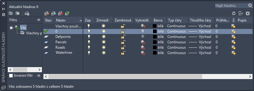 Zobrazí se hladiny ve výkresu a jejich vlastnosti.