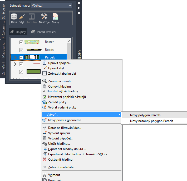 Každá položka v aplikaci AutoCAD Map 3D toolset má uživatelskou nabídku, která obsahuje příkazy, které jsou pro ni v daném okamžiku dostupné.