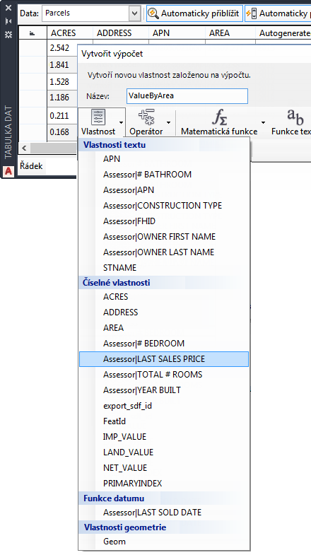 Informace z databáze Microsoft Access jste propojili s hladinou obsahující parcely. Uložili jste hladinu do nového souboru SDF a tak zpřístupnili všechny její data. Použili jste nový zdroj dat k vytvoření vypočítané vlastnosti.