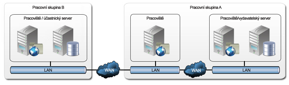Koncový stav: Dvě pracovní skupiny – pracovní skupina A je vydavatelský server a pracovní skupina B je účastnický server.