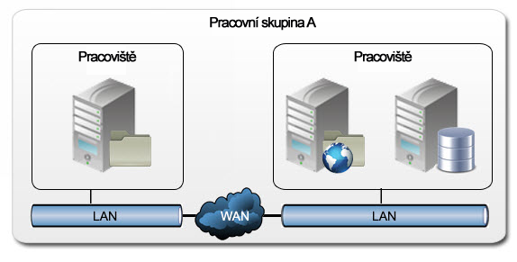 Aktuální stav: Pracovní skupina A se skládá z vydavatelského serveru a dvou pracovišť.