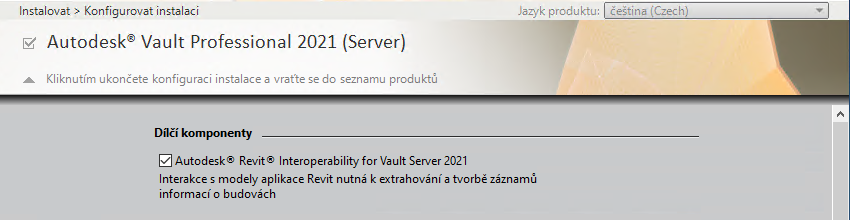 Doplněk Revit Interoperability se nainstaluje během instalace aplikace Vault Server. Na obrazovce Konfigurace instalace je nutné přizpůsobit možnosti aplikace Vault Server, aby zahrnovaly doplněk Revit Interoperability.