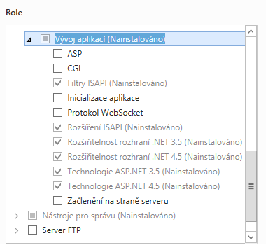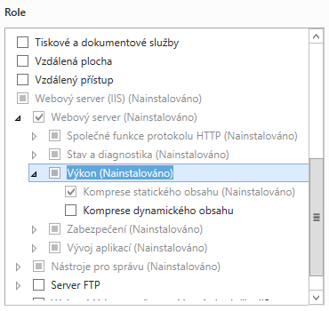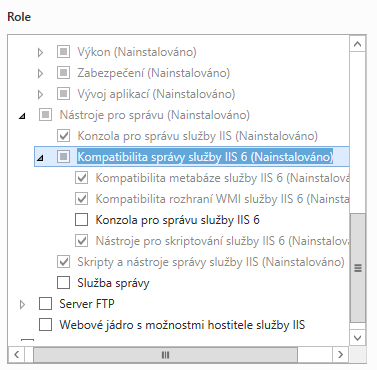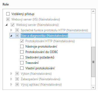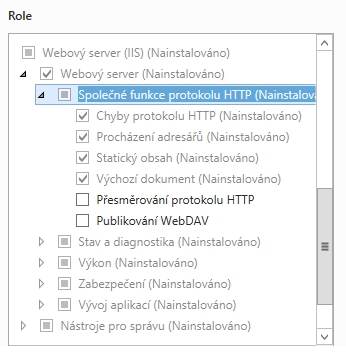 Poznámka: Případně lze službu IIS se všemi nezbytnými komponentami nainstalovat spuštěním následujícího příkazu na příkazovém řádku. Jedná se o jediný řádek příkazu. Pokud příkaz zkopírujete a vložíte na příkazový řádek, zkontrolujte, zda v příkazu nejsou přidány znaky návratu na začátek řádku nebo odřádkování, a případně je odeberte.