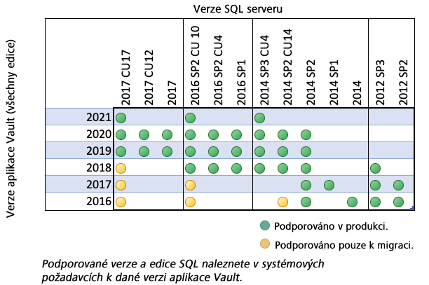 Následující tabulka označuje zelenými body kompatibilní verze aplikace Vault a serveru SQL. Žluté body představují doporučený průběh upgradu. Kompatibilitu své verze aplikace Vault a serveru SQL můžete ověřit v systémových požadavcích aplikace Vault.