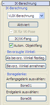 Wenn "Autom. Objektfang" aktiviert ist, führt 3ds Max automatisch einen IK/VK-Fang durch, bevor Sie "Aktiviert" auswählen oder die Auswahl aufheben. Wenn "Autom. Objektfang" deaktiviert ist, müssen Sie auf "IK/VK-Fang" klicken, bevor Sie die Option "Aktiviert" ändern, andernfalls springt die Kette.