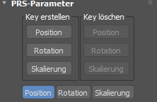 Mit den Schaltflächen in den Bereichen "Key erstellen" und "Key löschen" im Rollout "PRS-Parameter" können Sie Transformations-Keys im aktuellen Frame erstellen oder löschen. Diese Schaltflächen sind, je nachdem, welcher Key-Typ am aktuellen Frame vorliegt, aktiv oder nicht aktiv.