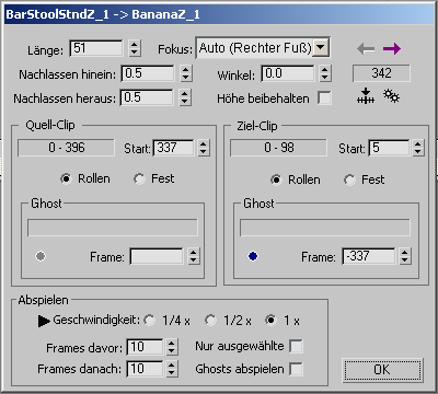 - Mit dieser Option wird der Wert aus dem Feld "Frame" im Bereich "Ghost" in das Feld "Start-Frame" im Clip-Bereich übertragen. Die Position des Ziel-Clips wird so verändert, dass sich der Biped-Körper im Ziel-Clip an den Biped-Körper im Quell-Clip anpasst.