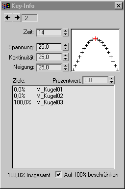 Hier werden alle Morph-Ziele für das Objekt zusammen mit dem Prozentwert für ihren Einfluss am aktuellen Key aufgelistet. Unter dem Fenster wird der Gesamtprozentwert aller Ziele angezeigt. Sie können beliebige Ziele in diesem Fenster auswählen und ihre in Prozent angegebene Wirkung dann mit dem Zahlenauswahlfeld auf der rechten Seite einstellen.