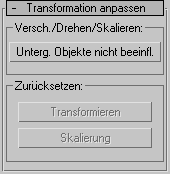 Mit den Schaltflächen im Rollout "Transformation anpassen" können ein Objekt und sein Drehpunkt transformiert werden, ohne dass die untergeordneten Objekte beeinflusst werden. Das Anpassen der Objekttransformationen hat auf die untergeordneten Objekte keinerlei Wirkung.