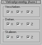 Wenn ein Kontrollkästchen aktiviert ist, werden die Transformations-Informationen vom übergeordneten Objekt für die betreffende Achse an die ausgewählten Objekte weitergegeben. Wenn ein Kontrollkästchen deaktiviert ist, werden die Transformations-Informationen für diese Achse von den ausgewählten Objekten ignoriert.