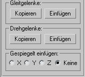Mithilfe der Schaltflächen zum Kopieren und Einfügen im unteren Teil des Rollouts "Objektparameter" in der Hierarchiegruppe können Sie einen ganzen Satz Gelenkparameter von einem Objekt in ein anderes Objekt kopieren.