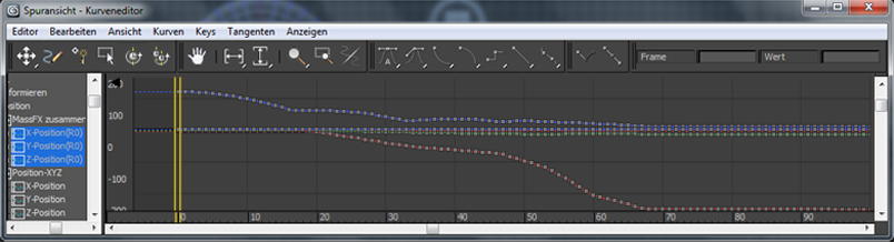Die Spuransicht wird im Kurveneditor-Modus geöffnet. Nur animierte Spuren des ausgewählten Objekts werden im Fenster Hierarchie der Spuransicht – Kurveneditor markiert. Dies ist die Vorgabe.